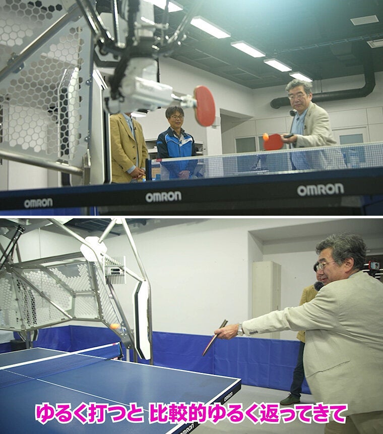 AI研究のパイオニア、京都橘大学の松原仁教授は、「(オムロンのフォルフェウスは)ゆるく打つと比較的ゆっくり返ってきて、ちょっと図に乗って速い球にすると、速く返ってくる。こっちの能力に合わせている感じが賢い」と振り返ります。