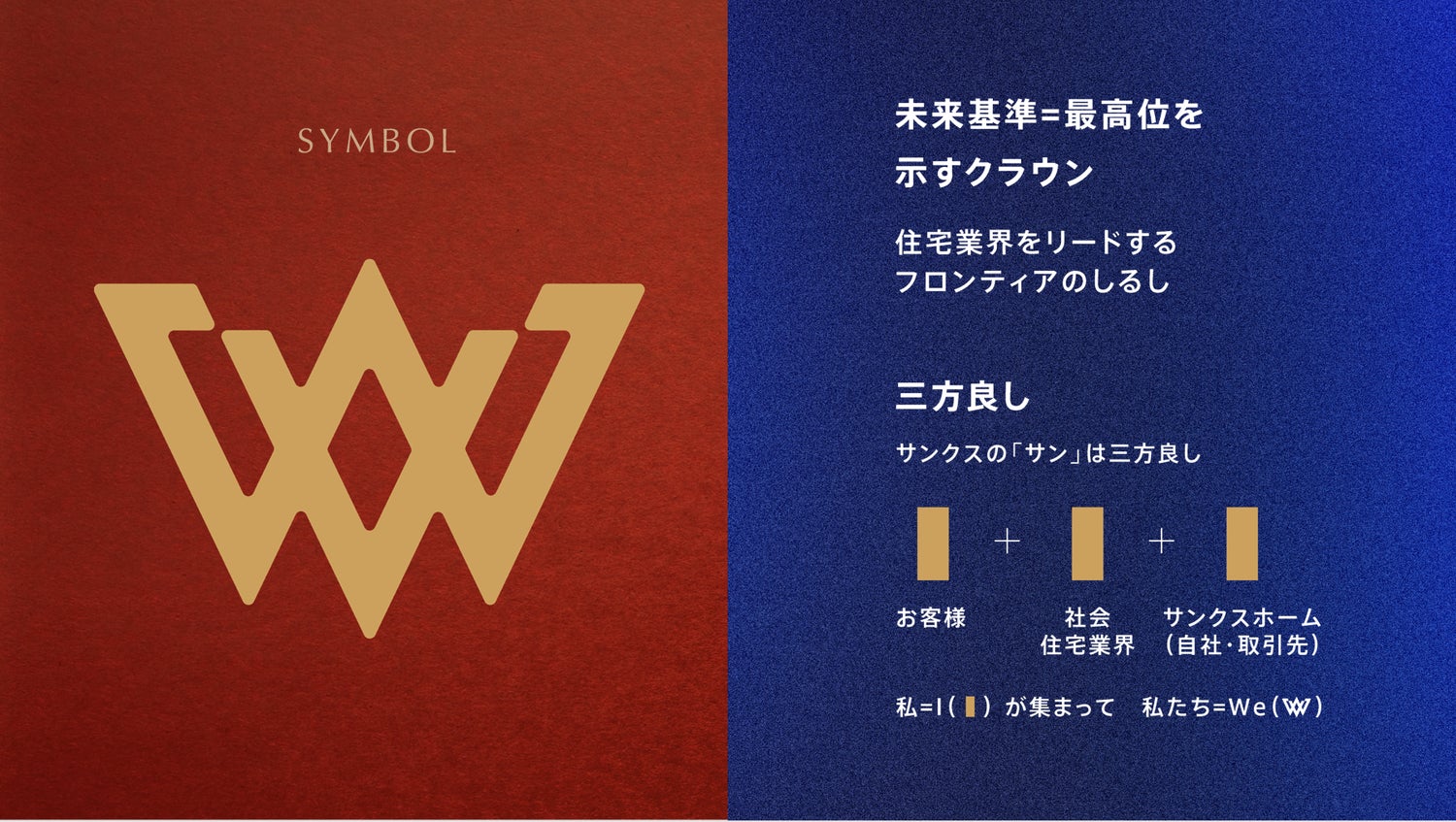 中心に据えたロゴマーク「サンクスクラウン」は、最高位を示す王冠の形の中に「三方よし」の哲学を込めたデザイン。お客様・社会・サンクスホームの3つの「I」が合わさって「We」となり、その「W」が王冠を形成しています。