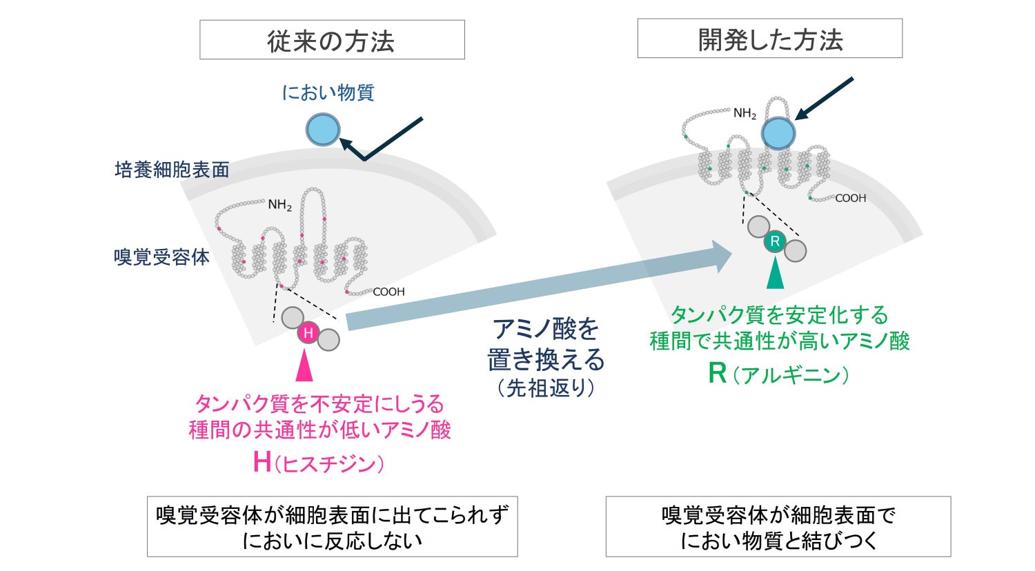 そこで得たのが、受容体の「アミノ酸配列」に着目する新機軸でした。松波教授らの先行研究は、培養細胞で機能しない受容体が、ヒトへの進化の過程で一部のアミノ酸が「奇抜なアミノ酸に変異した」ことを示唆していました。