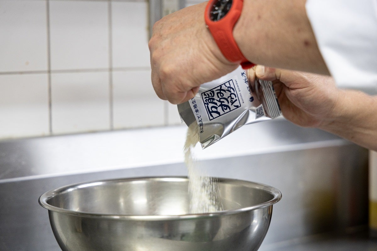 「生すり身を一から作ろうと思うと大変だし、長く置いておけないんですよ。でも、パウダーなら使いたいときに使えるのは本当に便利です」と筒井シェフは語ります。
