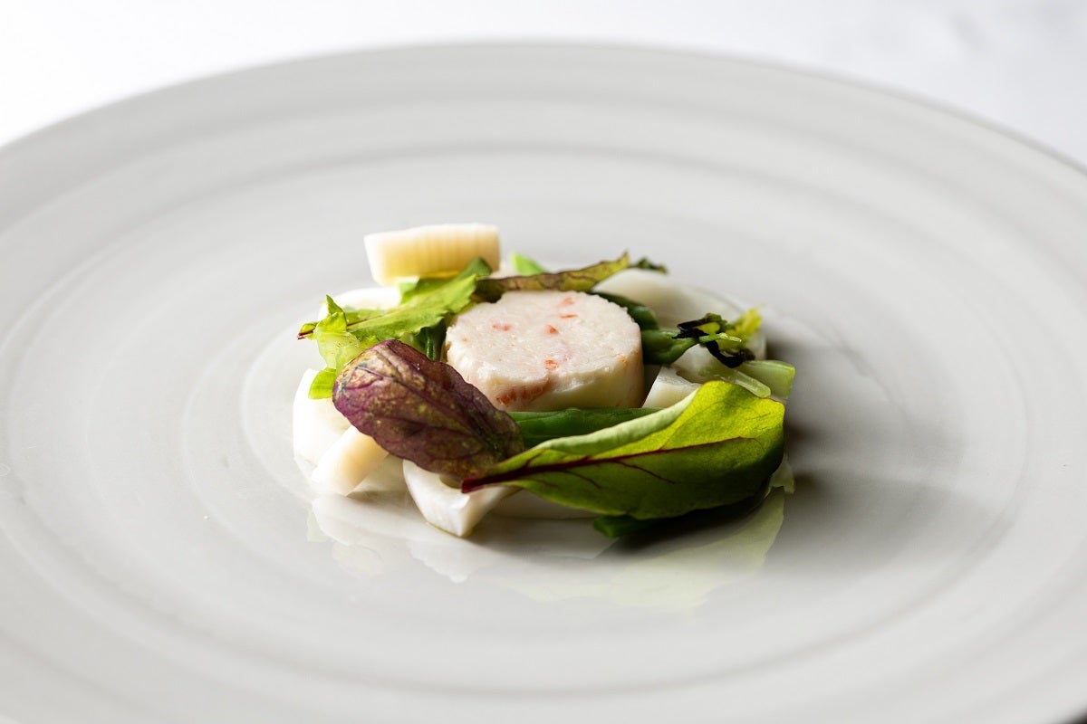 すり身パウダーを生クリームでのばし、タカアシガニのほぐし身と合わせたテリーヌです。