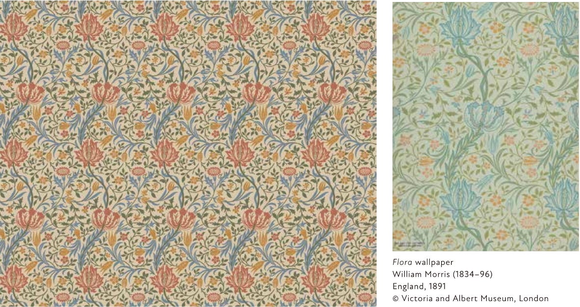 ゆるやかに流れる茎と花の繊細なパターンの「フローラ」は、ウィリアム・モリスが1891年に壁紙としてデザインしました。キャリアの晩年、モリスのテキスタイルへの情熱は壁紙デザインに反映され、フローラもその例外ではありません。モリス自身、このデザインをインテリアファブリックとして新しい配色でデザインし直したほどです。