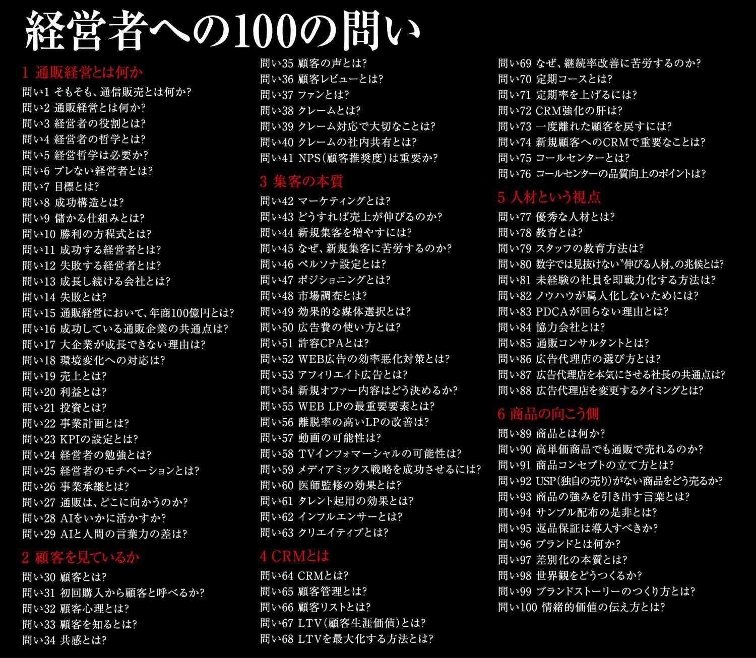 『通販の鬼』は、経営者に向けた「100の問い」とそれに対する私の答えという形式をとっている。それは、読者に私の答えをコピーさせるためではない。 「茂吉の答えはこうだが、あなたはどう考えるのか?」と問い続けることで、経営者の中に眠っている独自の哲学を引き出してほしいと考えたからだ。