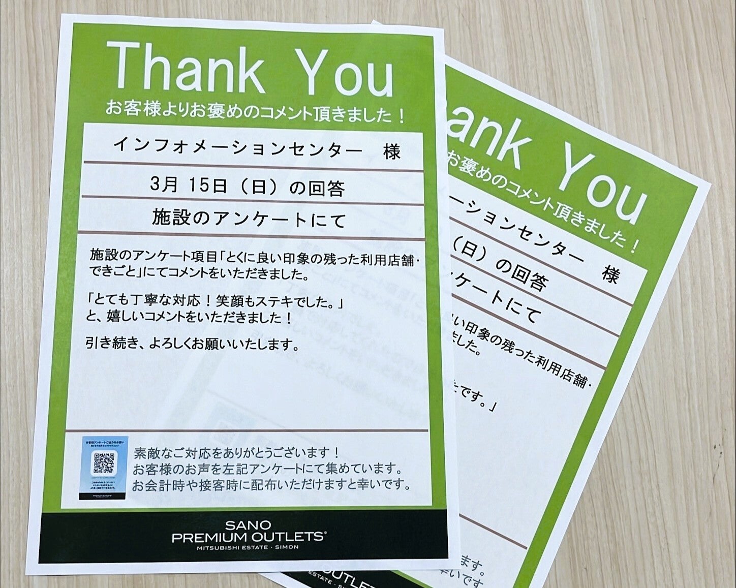 お客さまからのお声を店舗や管理会社に伝える「Thank youレター」(佐野プレミアム・アウトレット)