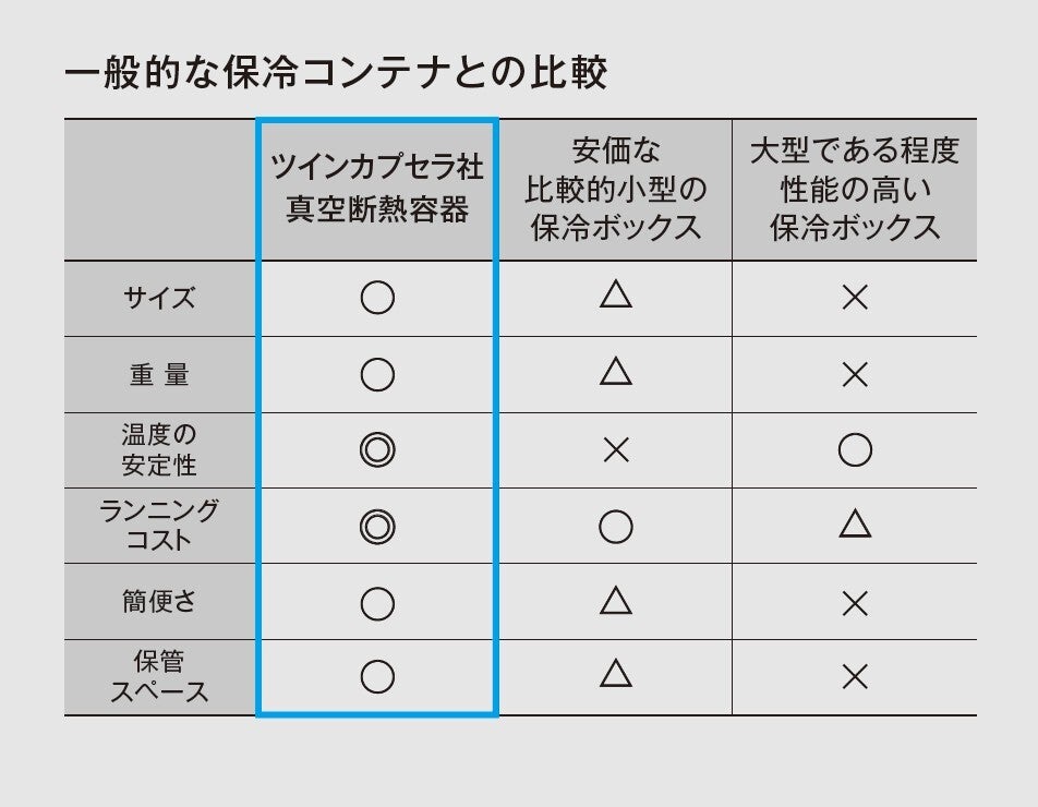 宮崎:「小型かつ高性能」というのが最大の特徴です。一般的に保冷ボックスの保冷性能はサイズに比例しますので、小型で超高性能な保冷容器というのは、これまでになかったものと言えます。小型にも関わらず高い保冷性能というのを実現できたのは、断熱容器に関して高い技術と経験をお持ちのタイガー魔法瓶さんと連携させて頂けたことが大きかったです。