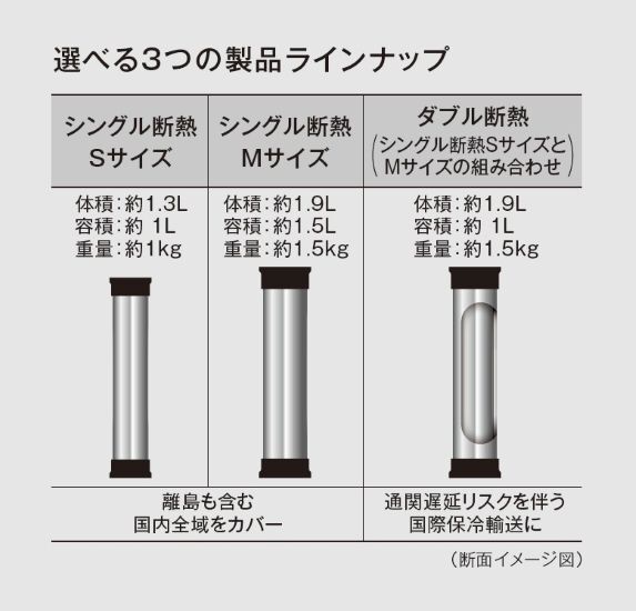 サイズを大きくすれば保冷時間を延ばせますが、それでは「小型かつ高性能」というコンセプトに反します。ですので、サイズは、宅配便の最低料金区分である60サイズ(縦横高さの合計が60cm以下)に納まることを目指しました。結果としてSサイズの容器は、60サイズにピッタリ収めることができ、保冷能力を輸送コストで割った「保冷のコストパフォーマンス」が最大になる設計となっています。
