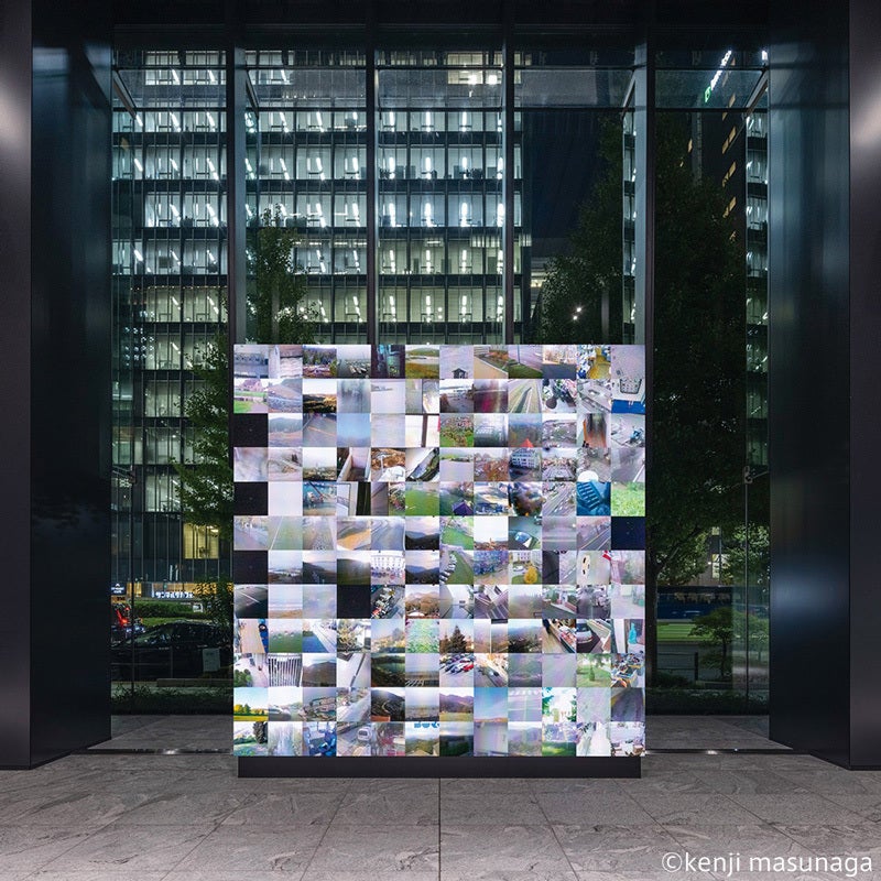 世界に偏在するCCTVカメラ映像を収集、これを一つの大きな窓に見立てたスクリーン上で組み合わせ、ビルの中と世界をつなぐことを意図した作品。