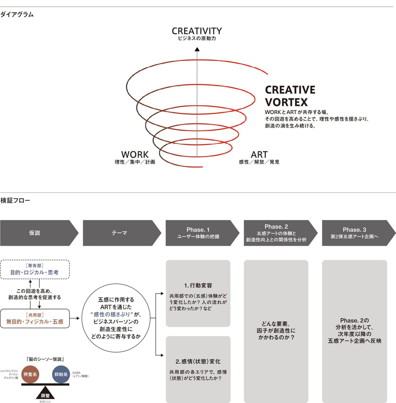 「目的(ロジカル)⇄ 無目的(フィジカル)の回遊を高めることで、創造的な思考を促進する」「アートにより五感を刺激することで創造的な思考を高める」ことを仮説とし、ビジネスパーソンの行動変容や感情(状態)変化から、アート体験の効果検証を行い、エビデンスを獲得していく。