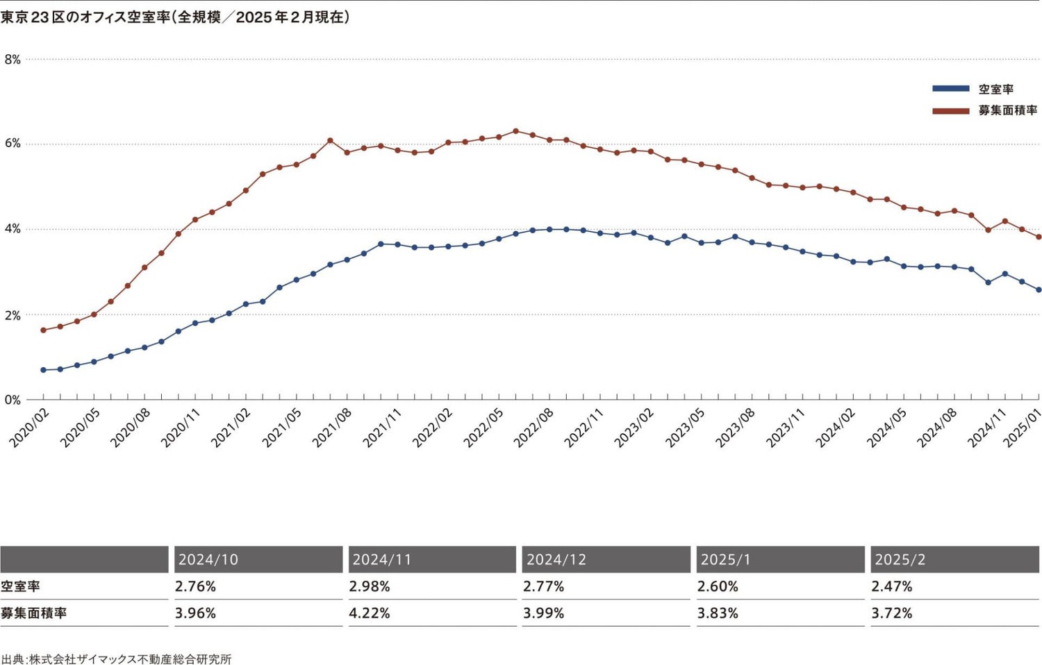 一方で、オフィス床の過剰供給と空室率の増加は社会的な課題でもある。これまでにもオフィス床の過剰供給は2002年問題、2007年問題などと称されてきたが、東京23区内ではそれを上回る需要拡大により顕在化せずにきた。しかし、2020年春以降の新型コロナウィルス感染症の蔓延に伴い、オフィスワークを取り巻く環境は大きく変化した。主にテレワークが普及したことにより、ワーカー個人のみならず各企業において働く場所と働き方のありようが見直され始めた。事実、東京23区内のオフィス床の空室率は2020年第1四半期では1%に満たなかったものが、以降、急激に増加している。