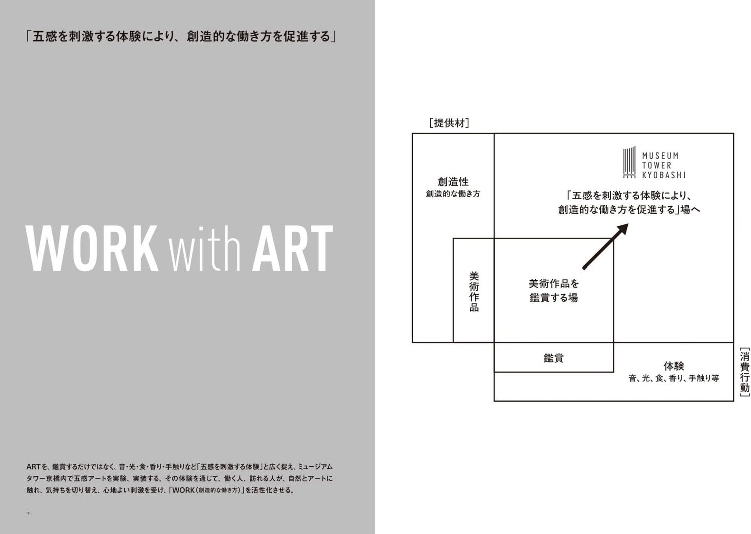 「WORK with ART」というコンセプトは、ミユージアムタワー京橋の独自性や京橋という街の個性とこれからのまちづくりを見定め、ワーキングプレイスおよびここで働く人々のニーズ、社会的動向の変化などに関するリサーチのなかから生まれた。これからのビジネスは、効率性を追求する「労働生産性」ではなく、新たな価値を生みだす「創造生産性」*が求められるとの仮説を立て、多面的な調査を実施。そのうえで、ミュージアムタワー京橋というオフィスビル単体の価値向上に止まらず、未来のオフィスビルのスタンダードとなることを見据えたリーディングプロジェクトと位置付け、新たな働き方の価値を杜会に提示していくことを目指した。
