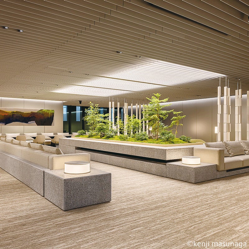 「武蔵野の森」をコンセプトにした植栽をラウンジの中央に設置し、周りに、待合スペース、ワークスペース、ミーティングスペースの三つの機能を備えたエリアを配置。環境音が流れ、ビルにいながら自然の移ろいを感じることができる。