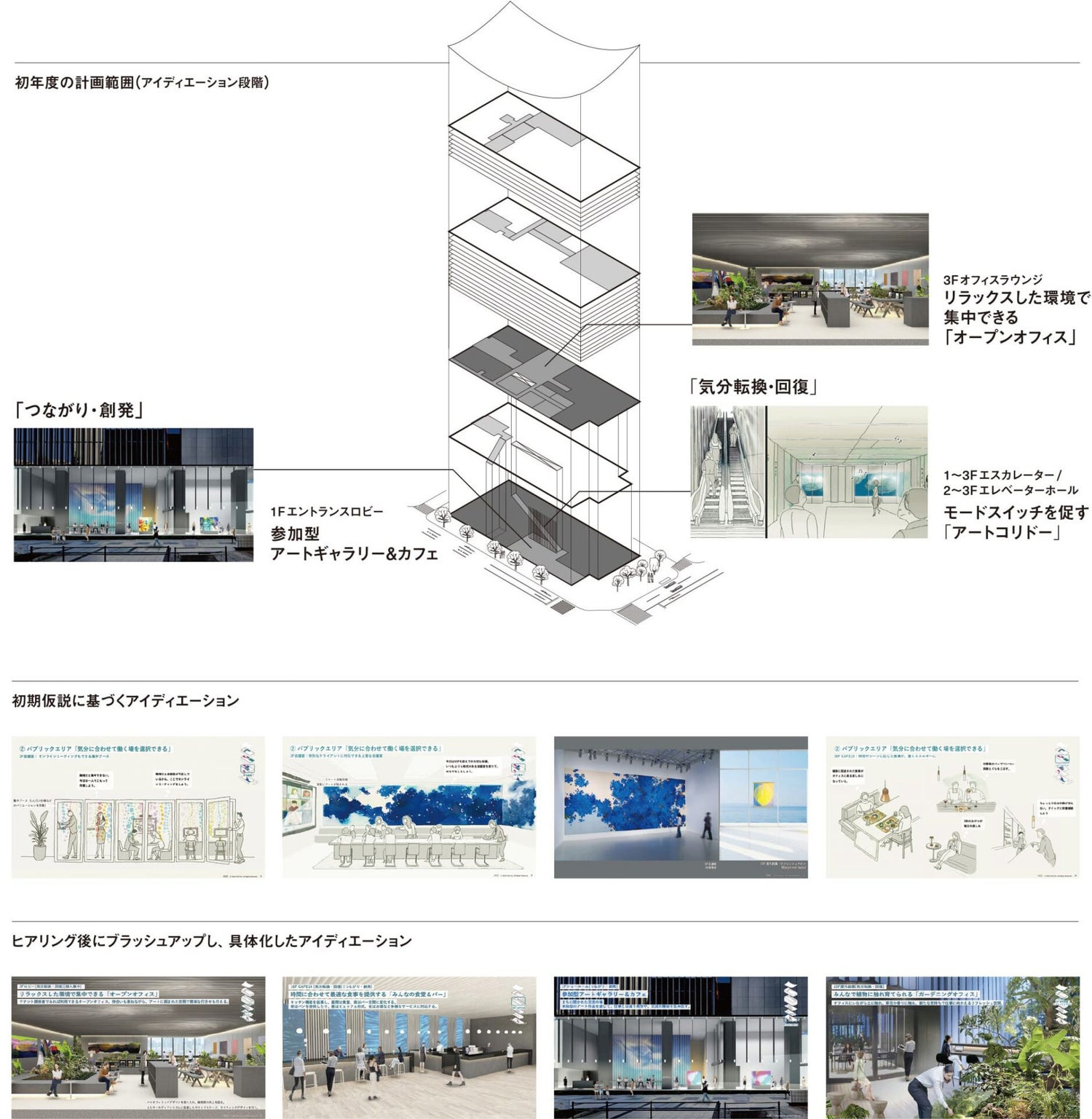 プロジェクトの第1弾としてアートを実装する場として、ビジネスパーソンが日々利用する共有スペースのうち、「1階エントランスロビー」「1階~3階エスカレーター」「3階オフィス ラウンジ」を選定。屋外に向けて開放感あるガラスファサードをもつ1階エントランスロビーを「参加型アートギャラリー&カフェ」と想定し「つながり・創発」の場に。1階~3階エスカレーター は「モードスイッチを促す〈アートコリドー〉」として「気分転換・回復」の場に。3階オフィス ラウンジは、「リラックスした環境で集中できる〈オープンオフィス〉」と位置付け「気分転換・回復」および 「個人集中」の場とすることを提案。初期仮説として構築した各フロアに対するアイディエーションをブラッシュアップし、施策を具体化していった。