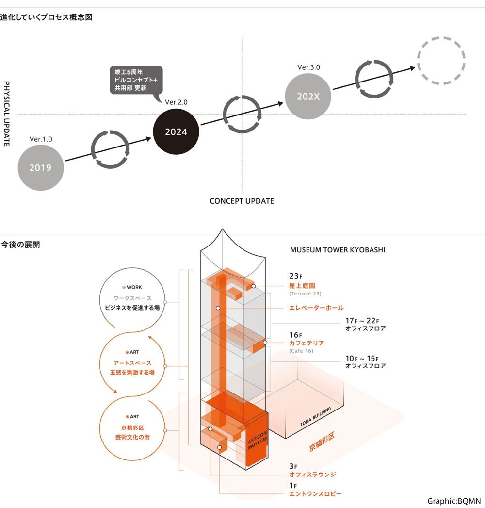 また、その実験過程を情報発信していくことで、創造生産性が高まるオフィスビルとしての認知も獲得していく。さらに今後は、2024年11月に実装した「五感アート」によるArtと Workの関係性を分析したうえで、さらなる効果が期待できるアートを発展的に充実させていく。「京橋彩区」との連携を深め、WORK with ARTプロジェクトが芸術文化の拠点として重要な役割を果たしていくことが計画されている。