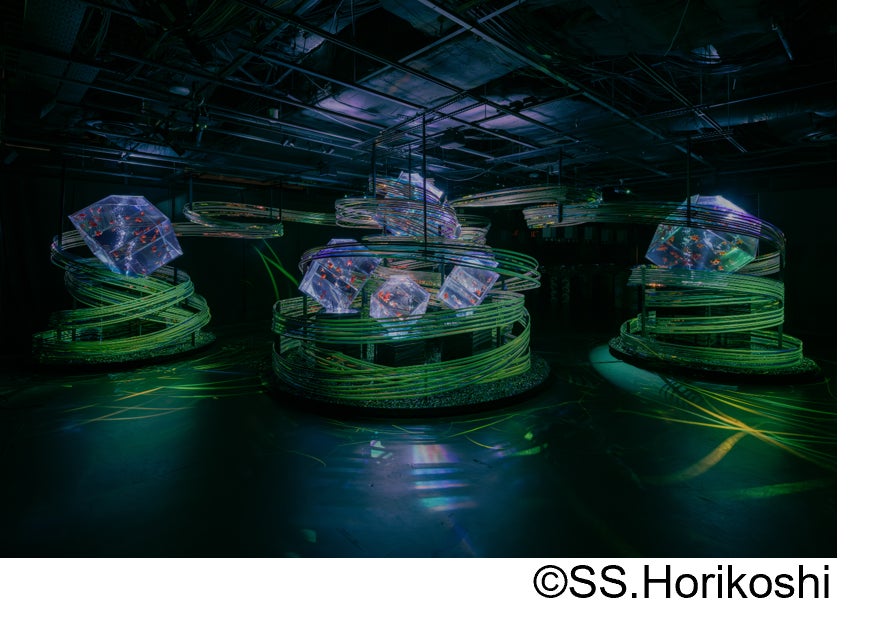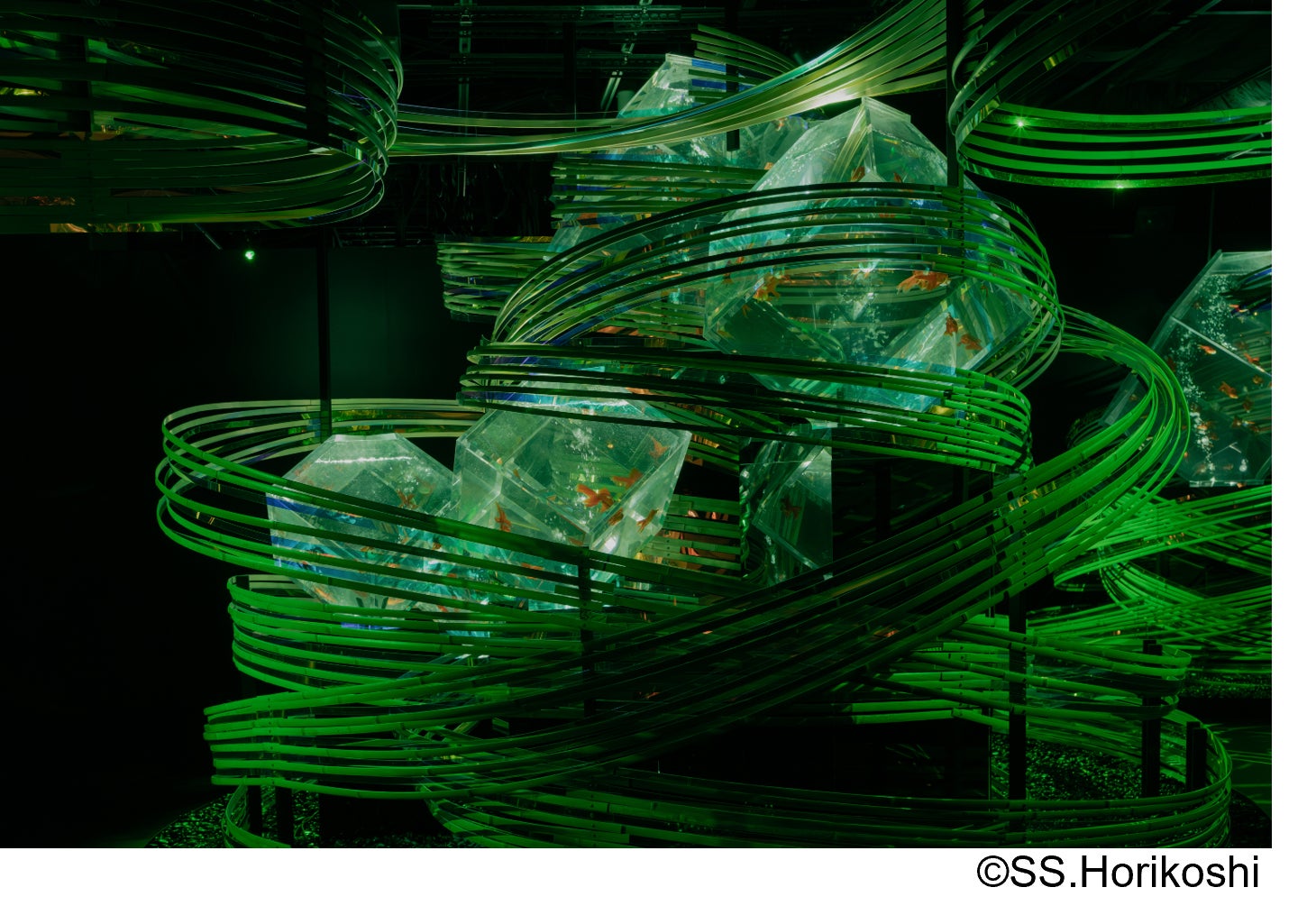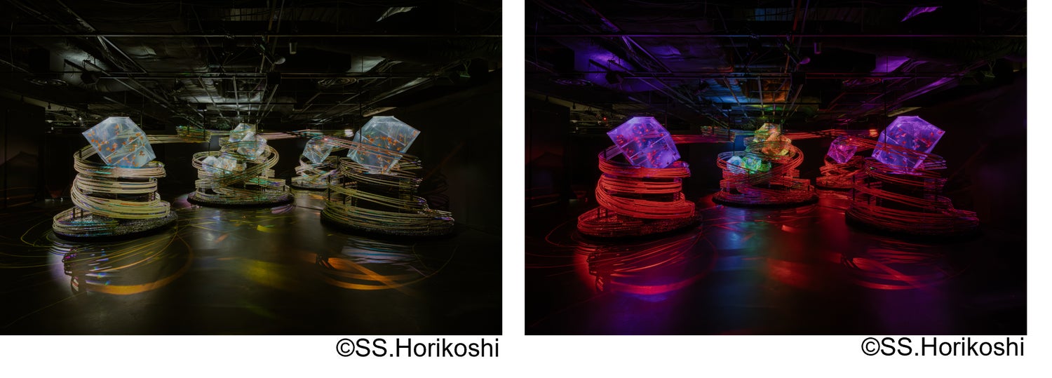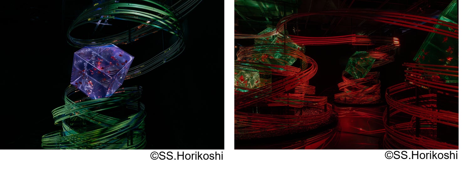 素材には、幅の細い平竹と透明アクリル板に偏光フィルムを施すことで、観る角度や光の変化によって多様な表情を引き出し、金魚の姿が水中で光を受けて揺らめくように、鑑賞者の移動とともに空間そのものが変容していく。