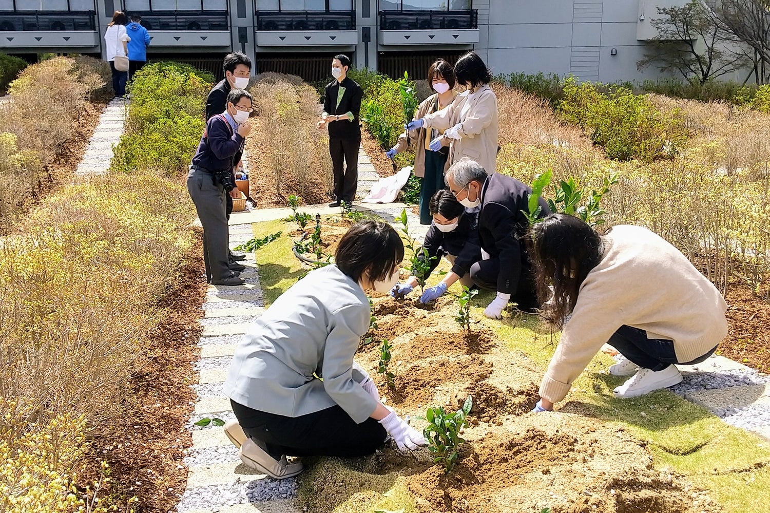 竹野さんの呼びかけで、スタッフだけでなく、その日お泊まりのお客様も一緒になって、新しい苗を植えていきました。