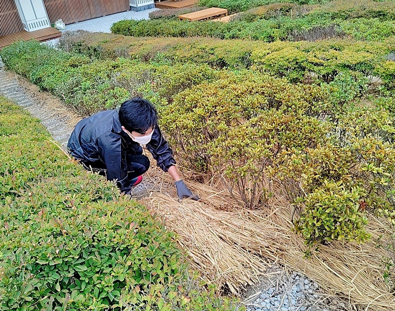 2025年10月。私たちは全員で冬備えのためにチャノキの根元に藁(わら)を敷き詰めました。凍てつく寒さから根を守るための藁は、その後徐々に土へ還り、お茶の栄養になっていきます。凍える寒さの中、みんなで笑いながら作業をしたあの時間は、今では私たちの強い連帯感の象徴です。