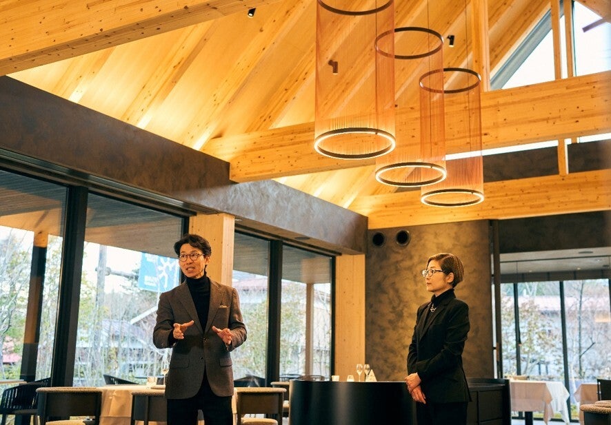 この建物の設計・施工を手掛けたのは住友林業で、河村はその建築デザイン部に所属している。住宅メーカーのイメージが強い住友林業が軽井沢でレストランの設計・建築を手掛けていることに、意外性を感じる人も少なくないだろう。同社でもまれであるレストランの設計プロジェクトを担当したのは、河村ともう1人、インテリアコーディネーターのマルイユ英里。住宅設計を主軸にしてきたこれまでのキャリアの中で、2人にとって初めて本格的に向き合うレストラン建築だった。