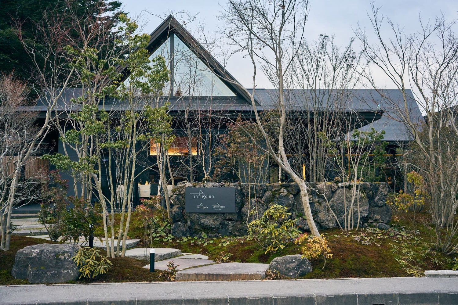 三角屋根が印象的なレストラン「L’inflexion」。豊かな植栽の奥に美しくたたずんでいる。