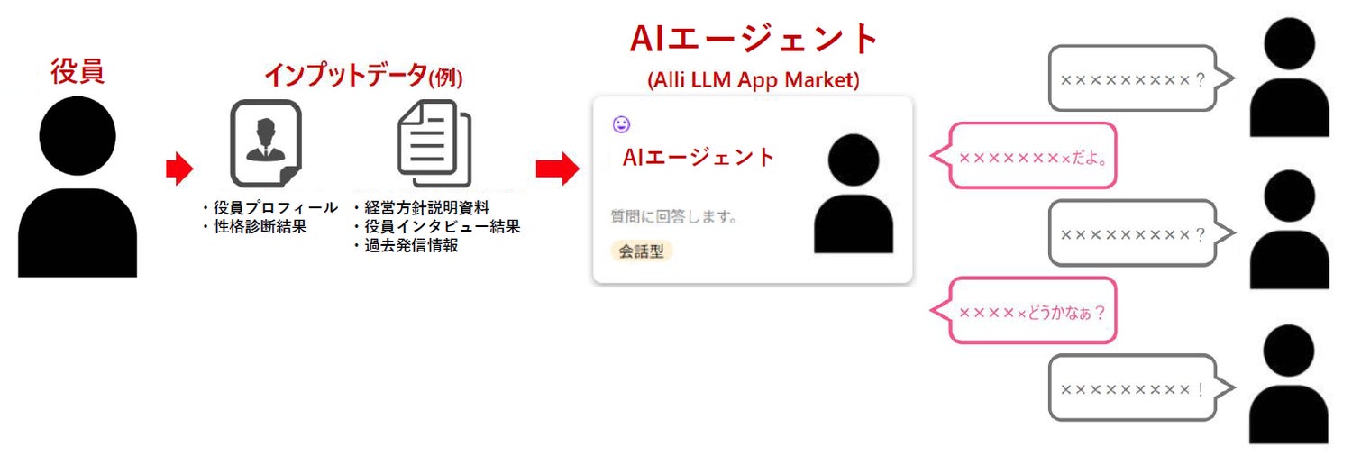 役員の考えや方針をAIで可視化し、社員との対話を補完する仕組みを示した図
