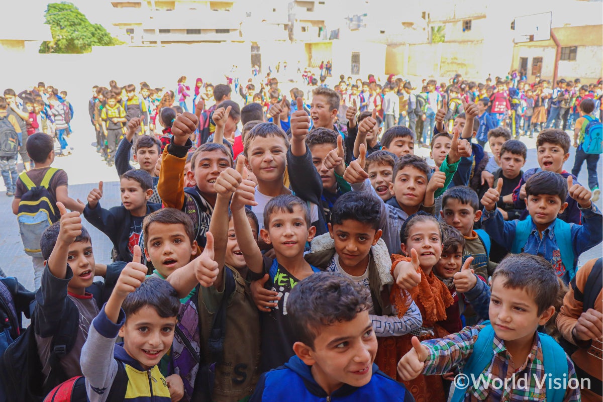 学校の休み時間に笑顔を見せてくれるシリアの子どもたち