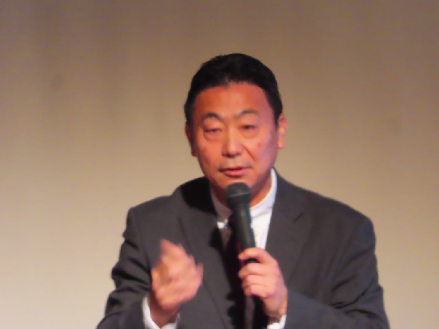 <写真:ビデオメッセージで登場の深谷市・小島進市長>