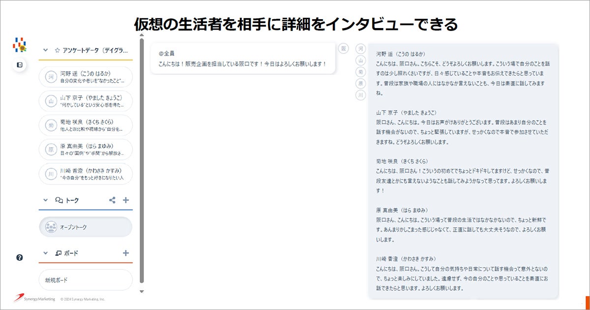 - 最適化された質問を仮想顧客像(仮想回答者)に投げかけ、対話を実施。