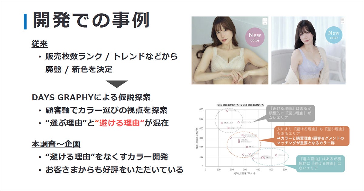 DAYS GRAPHYの特性が活かされたのが、同社アパレルブランドの主力商品であるナイトブラジャー「ふんわりルームブラ」のカラーバリエーションリニューアルの事例です。この商品は着心地やデザインだけでなく、カラーが重要な購買ポイントになります。