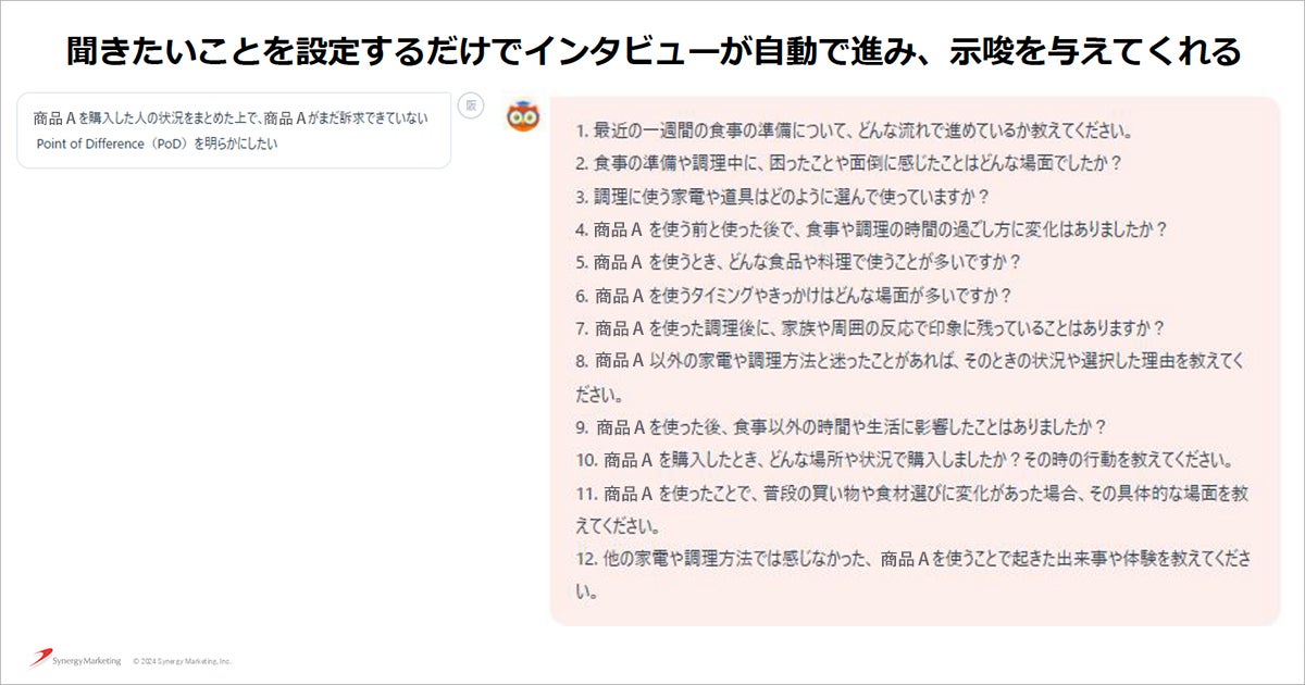 - 対話結果を踏まえ、「プロのモデレーターならどう解釈するか」という示唆(サジェスチョン)を出力。