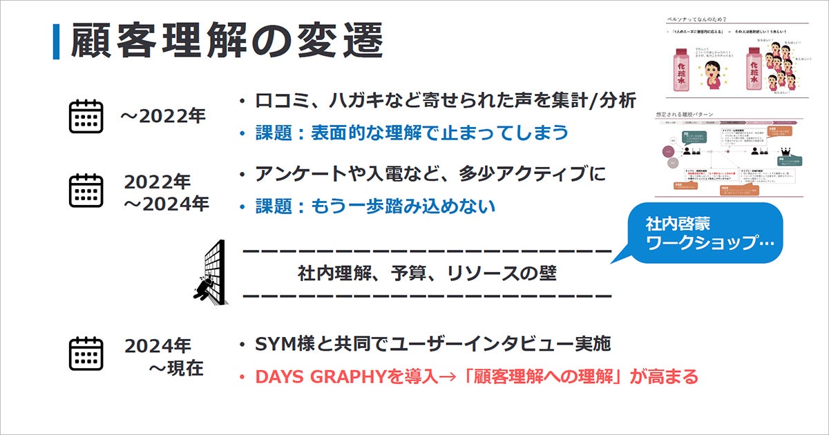 沢井氏は、次のステップとして、生成AIの「ないものを新たに作り出せる力」を引き出す挑戦をされています。なかでも、商品開発の根幹となる「顧客理解の深化(顧客のことをより深く理解すること)」に注力すべく、「DAYS GRAPHY」を導入されました。その背景には、顧客理解に関する「費用対効果」と「社内の認識(カルチャー)」の障壁がありました。