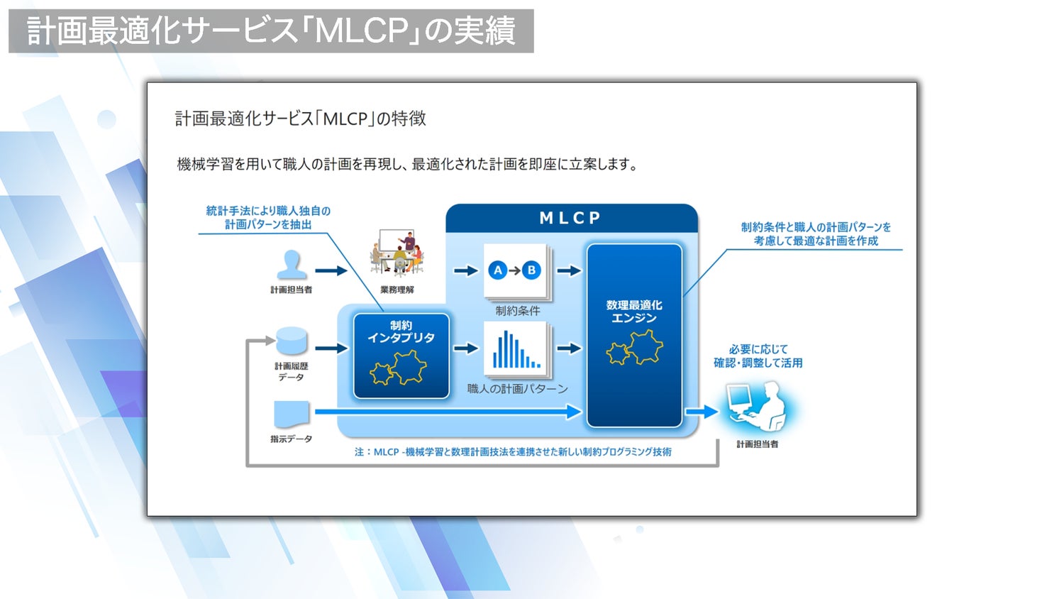 計画最適化サービス「MLCP」は、単なる機械的な計画立案だけではなく現場で使える最適解を導き出す実践的な計画最適化サービスとして多くの定量的効果を生み出してきました。