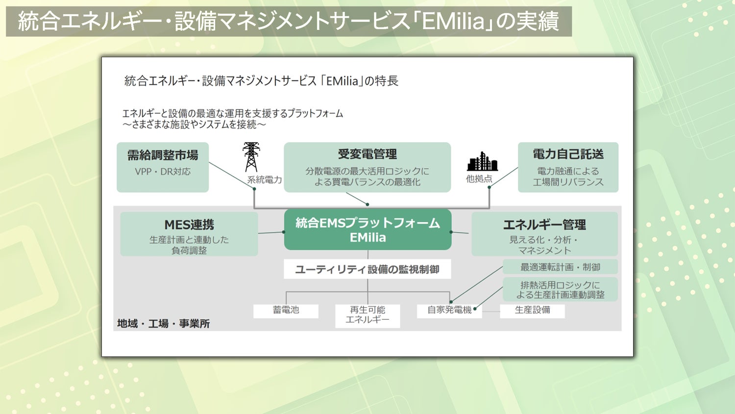 工場の中だけではなく外部の再生可能エネルギーや蓄電所・発電所とも連携をしまして地域全体を視野に入れたエネルギーマネジメントを可能にすることができます。