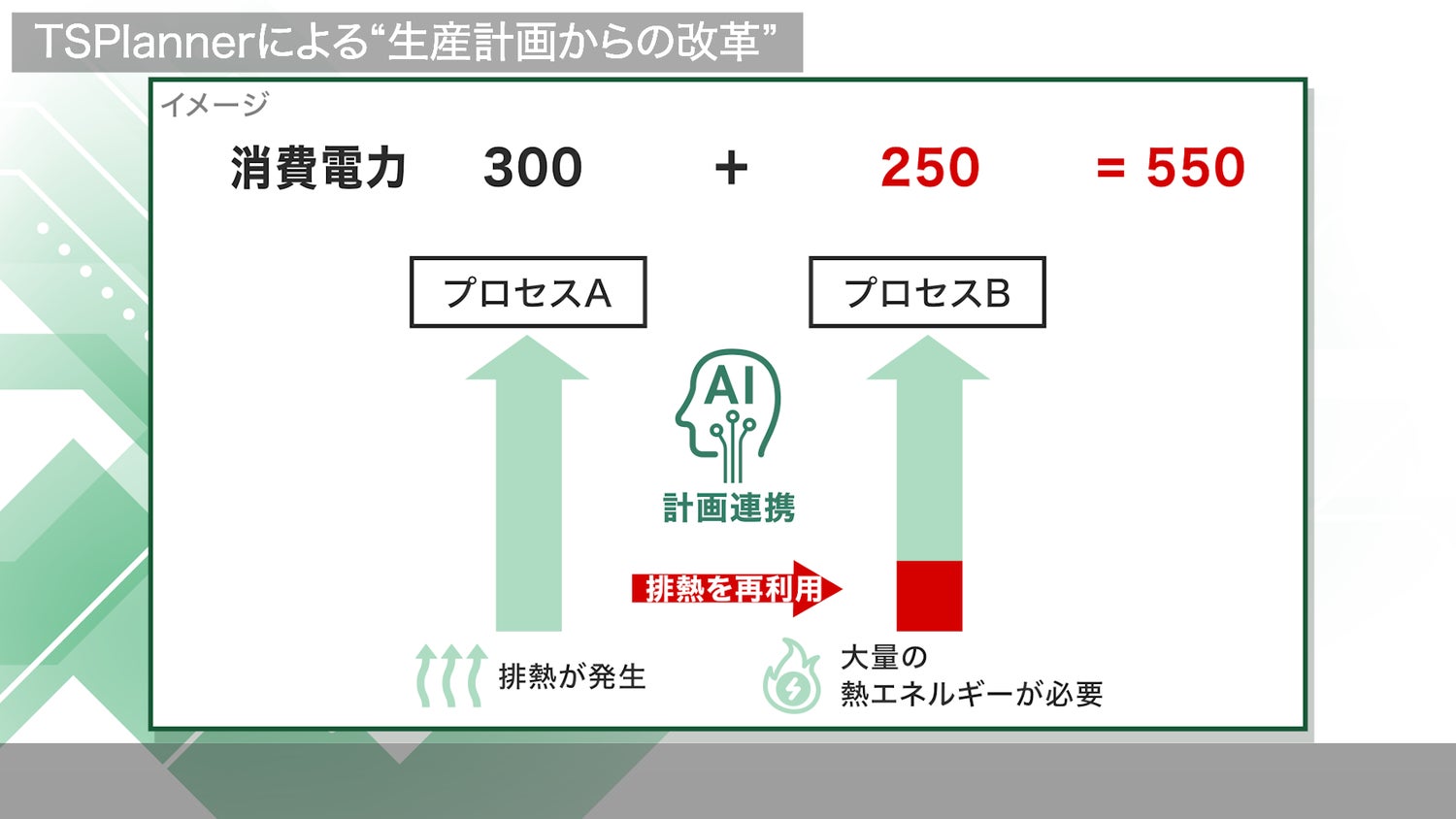 そこでTSPlannerがAIで過去の生産計画と電力使用量のデータを分析。Aの排熱をBで再利用できるよう稼働タイミングを最適に揃える計画連携を提案します。