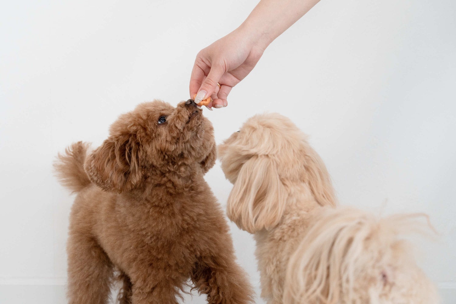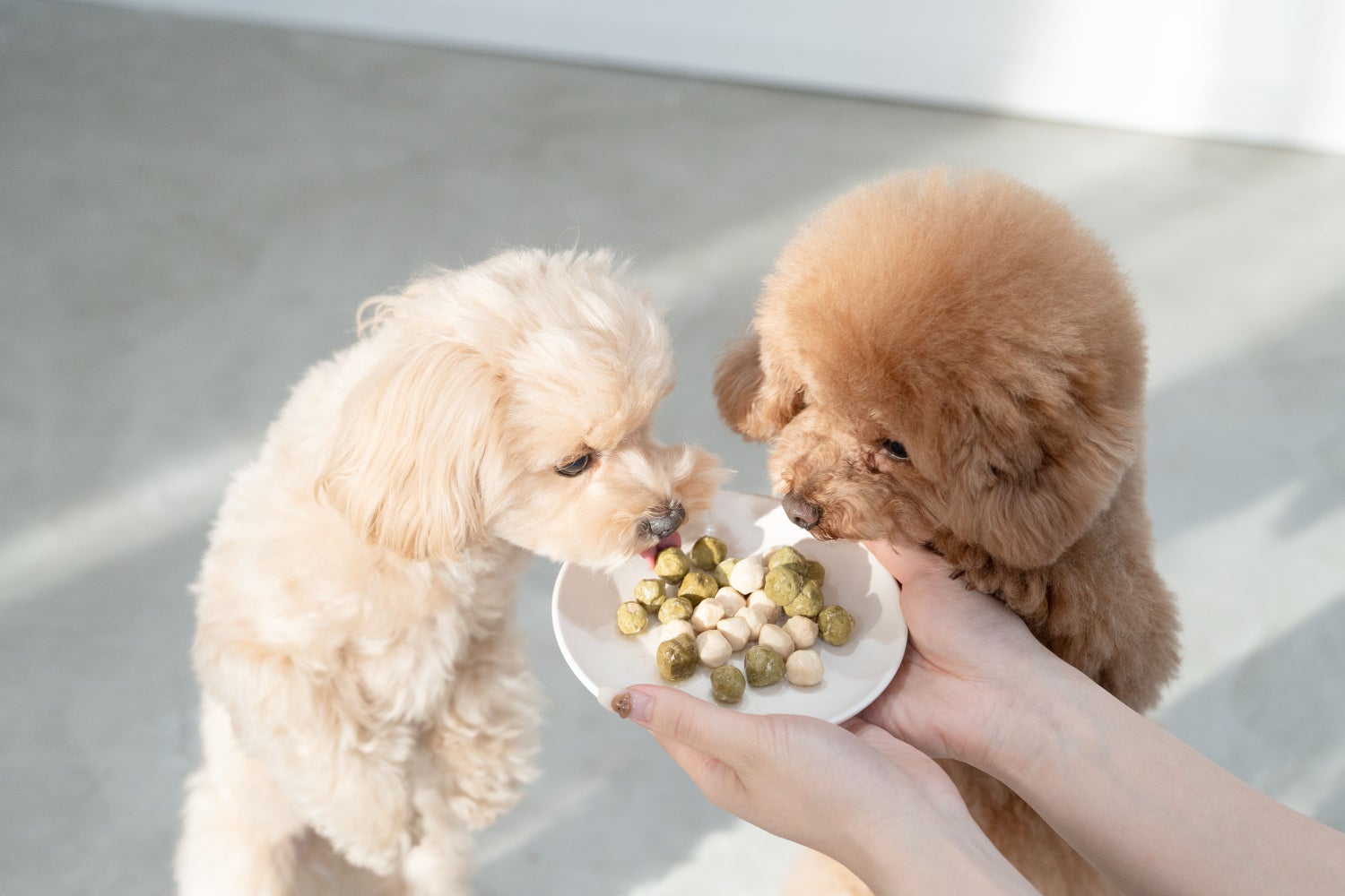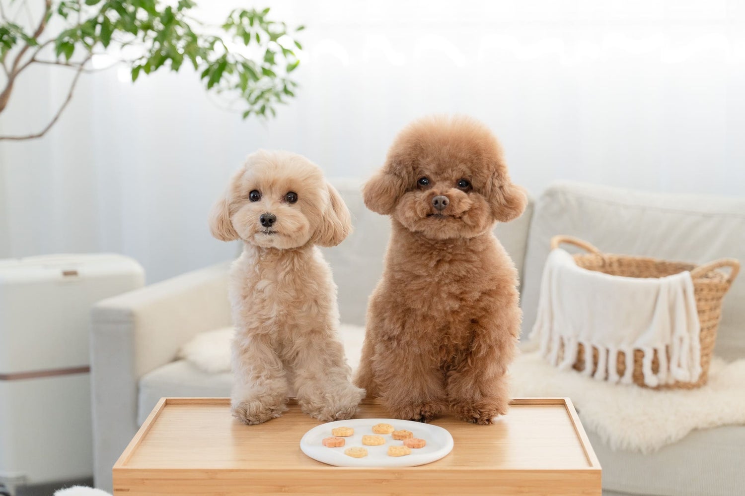 社員犬のぽぽとウニをはじめ、社員のわんちゃんたちにモデルとしておやつの横に並んでもらったのですが、どの子も美味しそうな匂いに我慢できず、ちょっと目を離した隙にパクッ! 食べられてしまうハプニングが続出しました。
