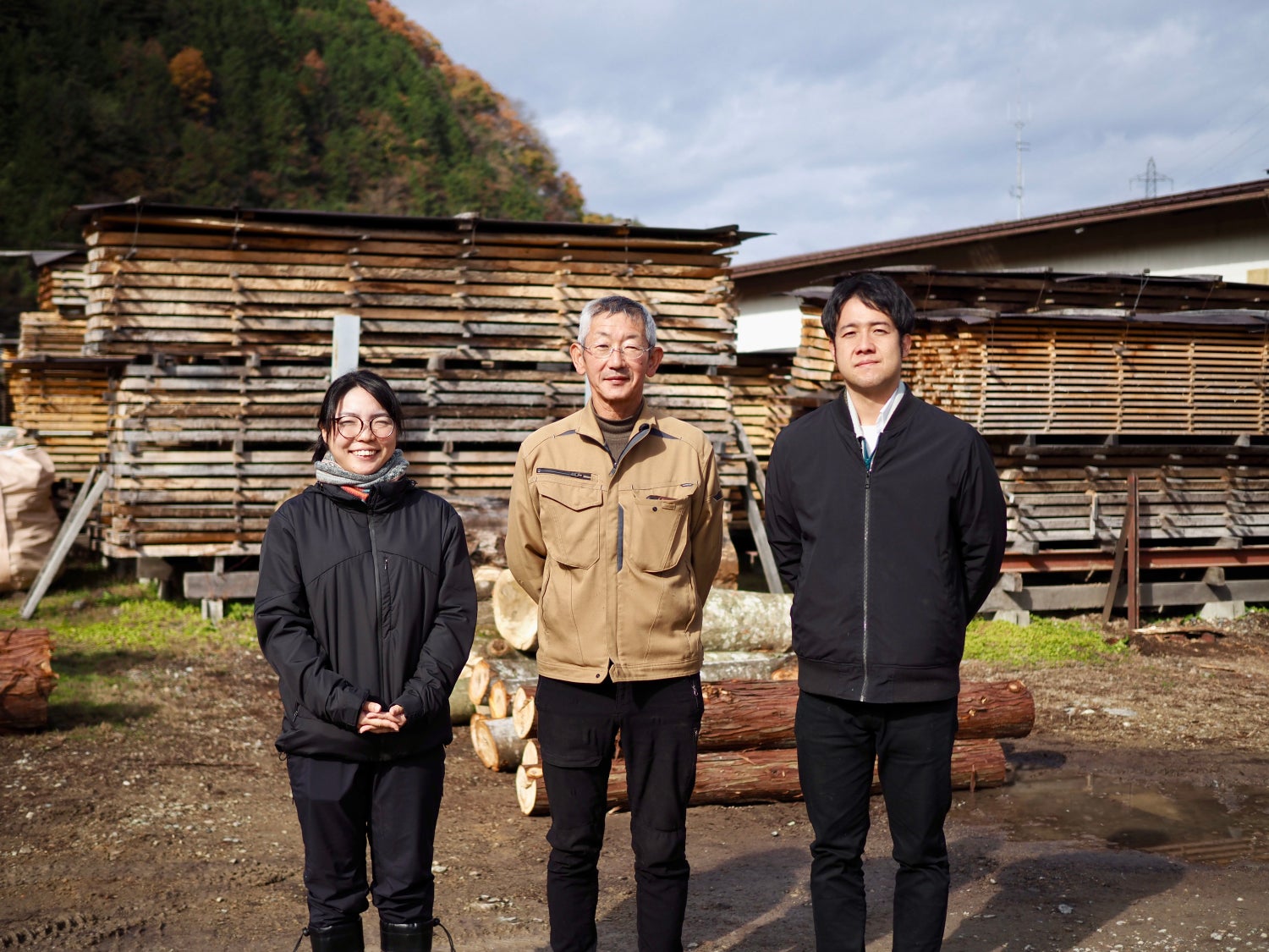 「売れない」とされていた小径の広葉樹の産業化になぜ成功したのか。その理由を、株式会社西野製材所の代表取締役を務める西野真徳さん(写真中央)、地域おこし協力隊の松野由季さん(写真左)、そして飛騨市役所林業振興課の砂田貴弘(写真右)に聞きました。