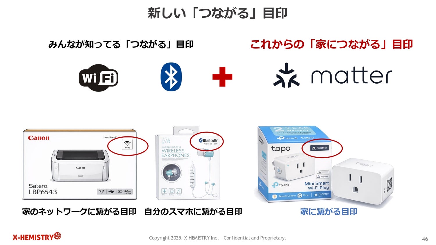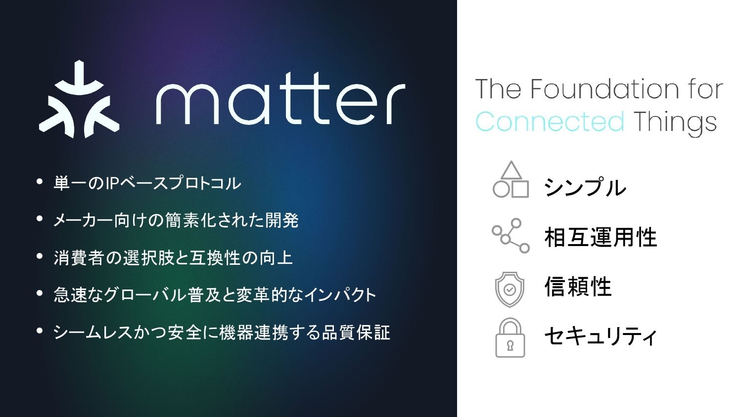 ユーザーも対応製品の選択に苦労していましたが、Matterはこの課題を解決し、誰もが当たり前に知っているWi-FiやBluetoothのように「つながる目印」となります。