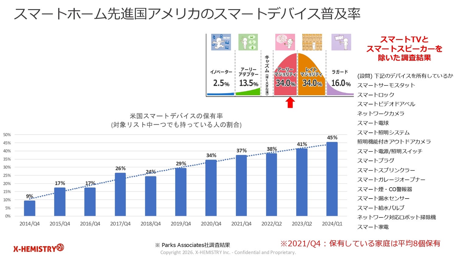 新貝氏率いるX-HEMISTRYでは、設定の複雑さを解消し、誰もが安心して使える環境を『スマートホーム2.0』と定義し、「普及率が50%に迫るアメリカに対し、日本はまだ10%~15%程度ではあるものの、Matter対応製品の増加により、普及段階に向けた準備が整ってきた」とみています。