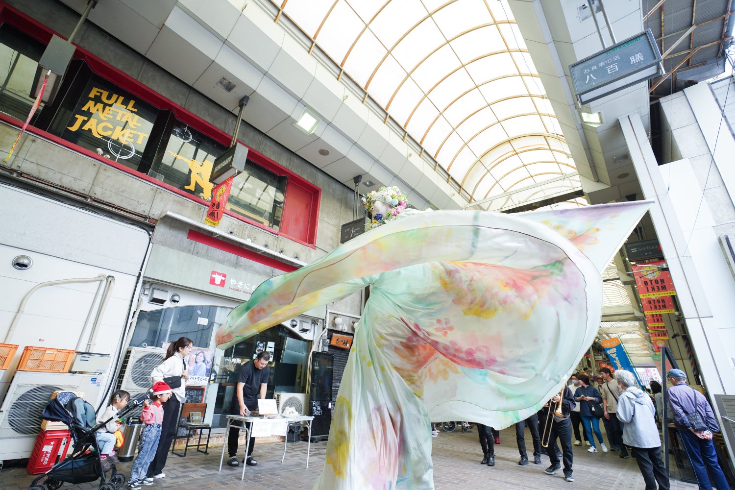 商店街のパレードで軽やかに舞う精霊「HARO」(足長ウォーキングアクト)。近寄ると風をはらんだ長い衣で包み込んでくれる。