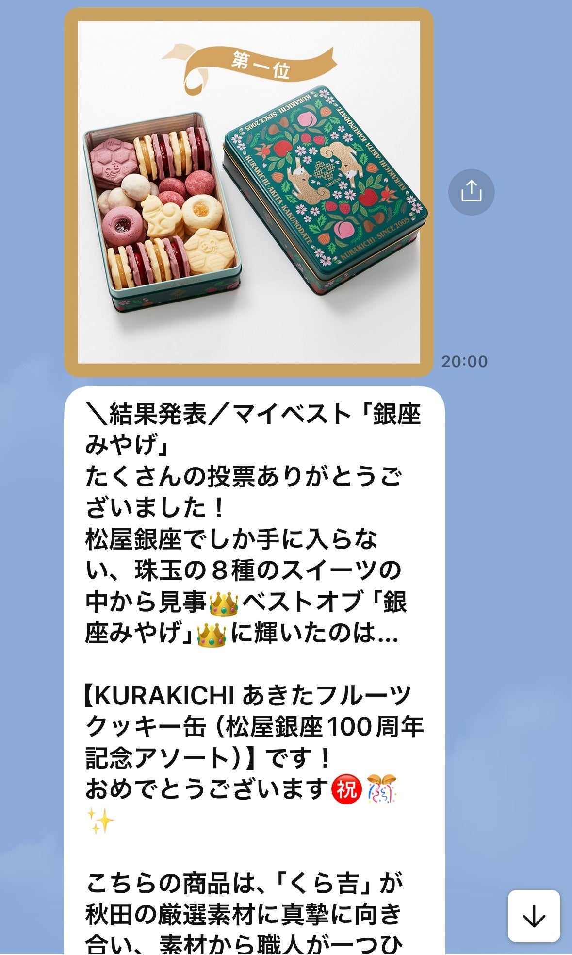 株式会社ゆう幸が運営しています秋田県・角館発の創作菓子ブランドくら吉が、東京・銀座の老舗百貨店松屋銀座とタッグを組んで生み出したコラボレーション商品KURAKICHI あきたフルーツクッキー缶(松屋銀座100周年記念アソート)が、来場者や一般参加者による館内パネル及びオンラインでの投票で“イチオシの銀座みやげ”を選ぶ「マイベスト銀座みやげ」で、堂々の第1位を獲得しました。
