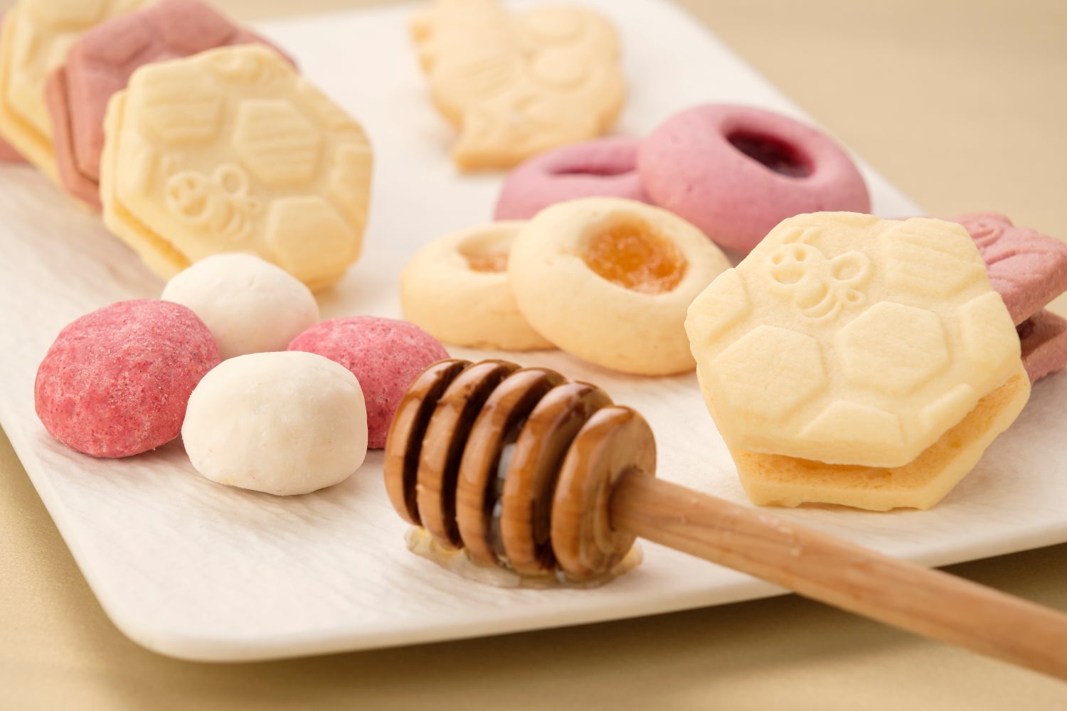 このアソートのために新たに6種類のクッキーを開発。ハチの巣穴を模したデザインのクッキーを2種類入れて、見た目にもはちみつをイメージしているほか、ほろほろとした食感が楽しめるスノーボールなど7種類のクッキーが入っています。