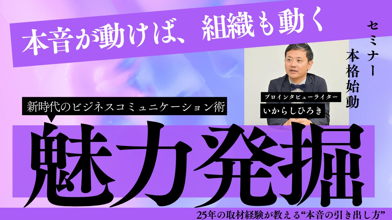 「部下の本音が聞けない」「商談で顧客の本当のニーズが掴めない」「広報の取材でもっと深い話を引き出したい」ーーそんな悩みを抱えるビジネスパーソンのために、プロのインタビューライター・いからしひろきが20年以上・1000人超の取材経験から培った「本音を引き出すコミュニケーション技術」を体験できる90分のセミナーです。