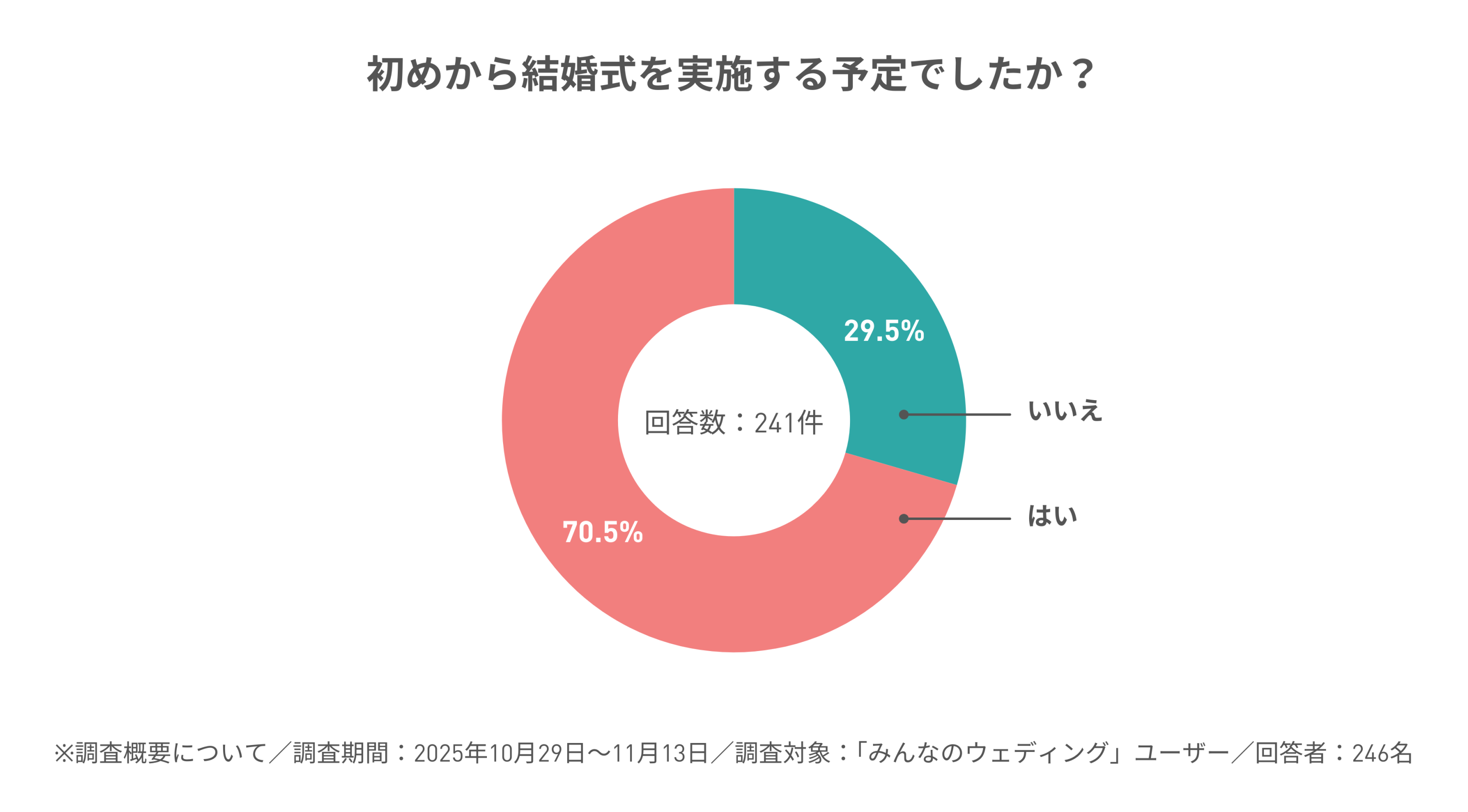 「みんなのウェディング」が246名のユーザーを対象に実施した調査※で、結婚式を「実施した」もしくは「これから実施する予定」と回答した241名のうち、約3割にあたる29.5%が「初めから結婚式を実施する予定ではなかった」と答えています。