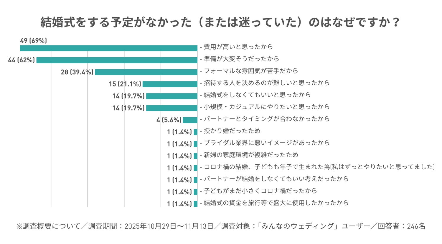 理由として多く挙げられたのは、「費用が高いと思った」(69.0%)、「準備が大変そうだったから」(62.0%)、「フォーマルな雰囲気が苦手だから」(39.4%)といった声でした。