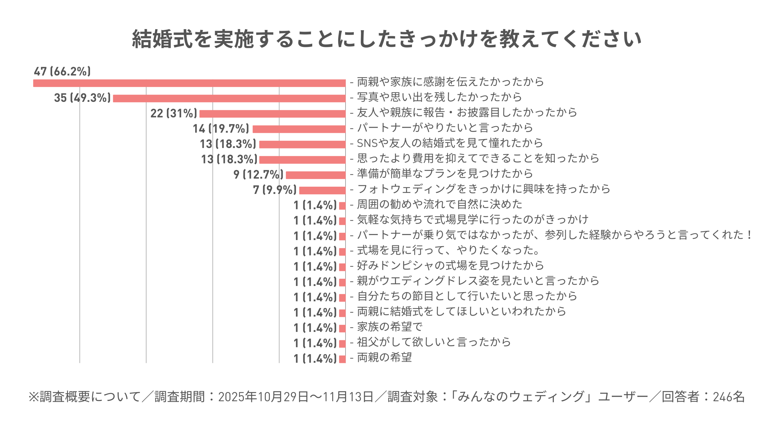 66.2%が「両親や家族に感謝を伝えたかったから」、49.3%が「写真や思い出を残したかったから」、31.0%が「友人や家族に報告・お披露目したかったから」と回答しました。