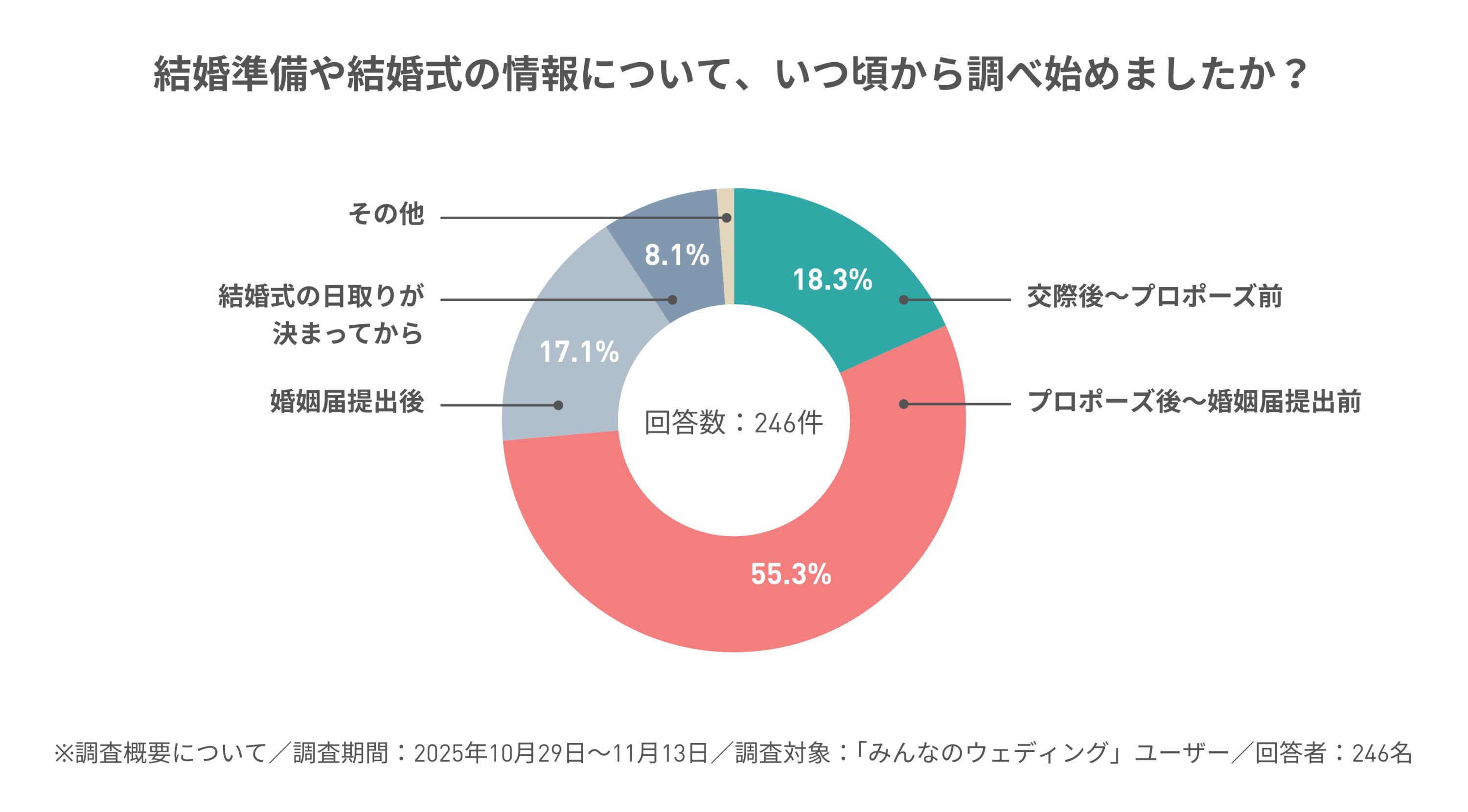 こうした変化は、情報収集のタイミングにも表れています。同調査で、結婚準備や結婚式の情報をいつ頃から調べ始めたかを聞いたところ、最も多かったのは「プロポーズ後〜婚姻届提出前」(55.3%)でした。一方で、「婚姻届提出後」(17.1%)と答えた人も一定数見られました。