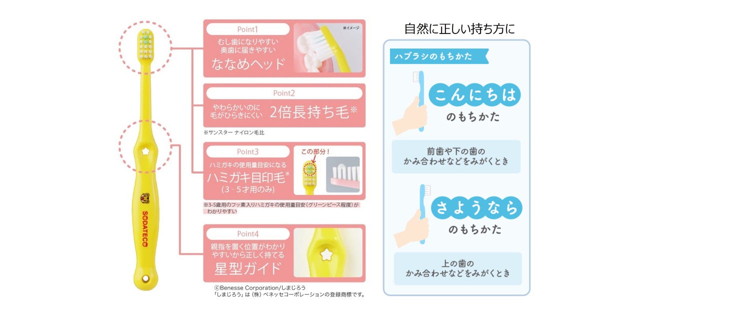 さらに、ヘッドの部分にもこだわりがあって、むし歯になりやすい奥歯にも届きやすく、みがきやすいよう8度の傾斜をつけています。また、3-5才用ハブラシには「ハミガキ目印毛」という青い毛束を配置し、この部分にペーストを付けることで3~5歳のフッ素ハミガキの推奨使用量(グリーンピース大、約5mm)が感覚的に分かる設計にしました。