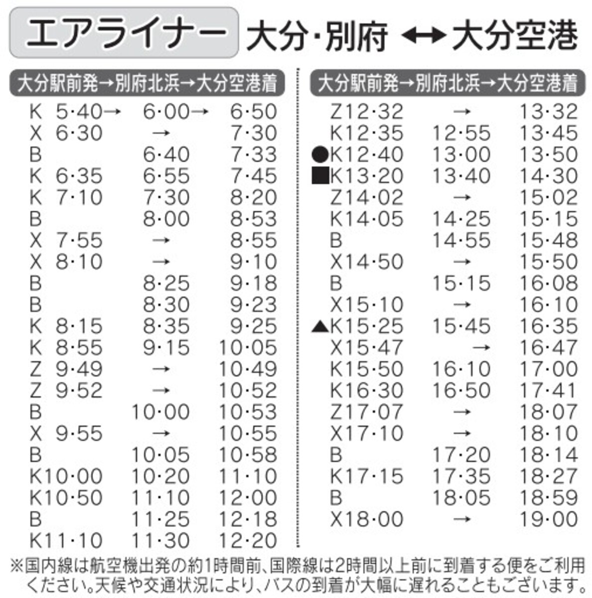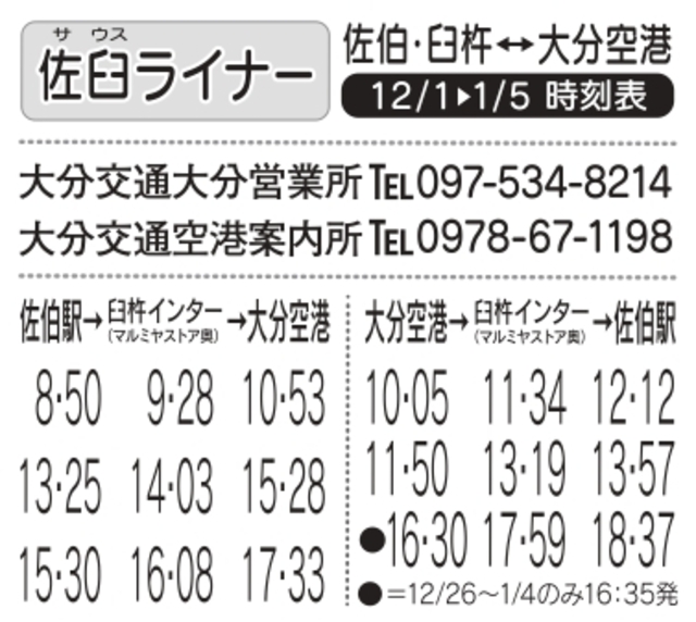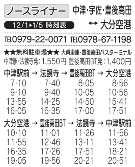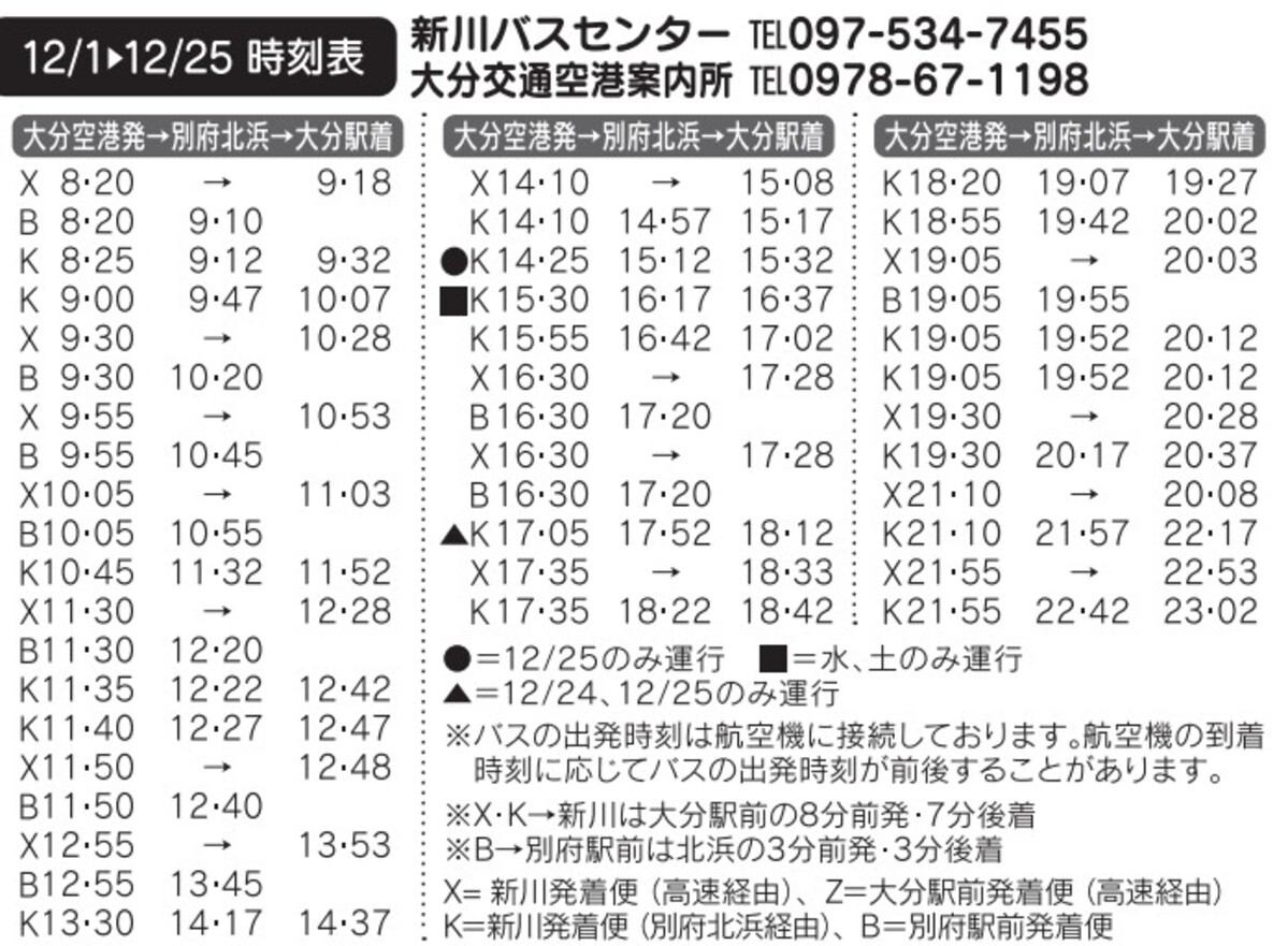 大分バス: 097-536-3371 大分交通: 097-536-3655 亀の井バス: 0977-25-3220 九州高速バス予約センター: 092-734-2727
