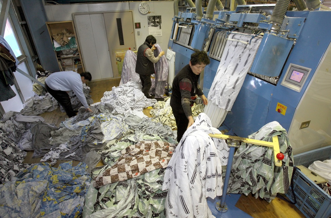 大型のマシンが重低音を響かせながら、丁字形の衣類をのみ込んでは吐き出してゆく。 ベルトコンベヤーに載せられた半乾きの洗濯物。次から次に高温スチームで圧をかけられ、最後はコンピューター制御の機械で1折り、2折り、3折り……。 パリッ...