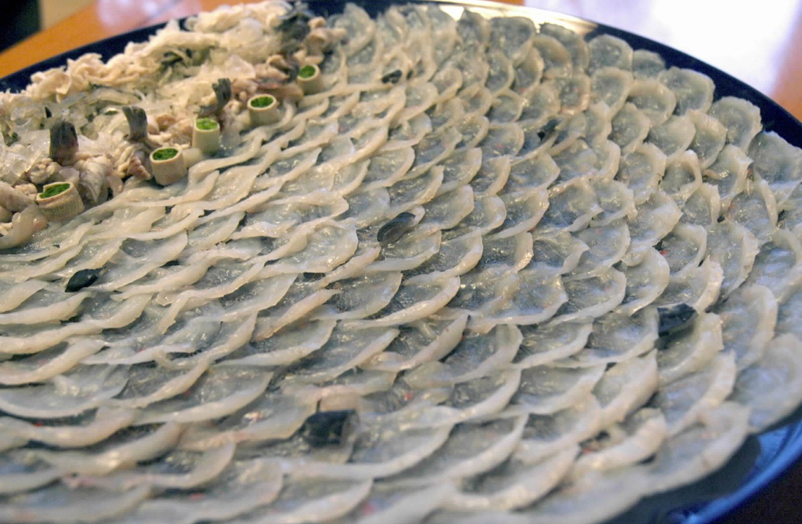 もはや芸術である。 客を喜ばす。そのためにまず、目で楽しんでもらう。 熟練の技が必要だ。 専用のふぐ引き包丁で身を薄く切る。包丁にまとわりつく身を切っ先に載せて、そのまま手を使わず大皿に1枚、1枚描いてゆく。 ふぐの波盛り...
