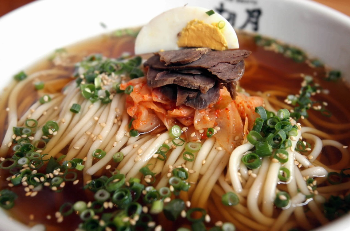 別府冷麺めん。 言わずと知れた湯の街オリジナルの食文化である。 キャベツのキムチ。牛肉のチャーシュー。三日月形にスライスされたゆで卵。 昆布などからだしを取った琥珀