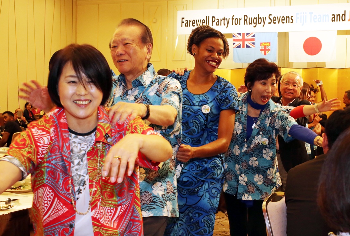 「カモン、ジャパン!」 昨年11月10日夕。ラグビー7人制のフィジー代表は上機嫌で母国のダンスを披露し、懇親パーティーの出席者を踊りの輪に誘った。 来県した男女チームの選手、スタッフら約30人は全面改修を終えた豊後企画大分駄原球技...